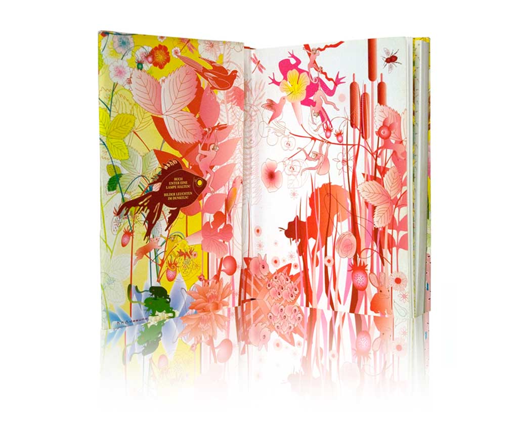 Werden diese Buchseiten unter eine Lampe gehalten, leuchten im Dunklen die Bilder!
